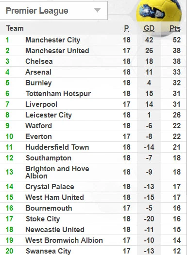 Bảng xếp hạng Premier League: