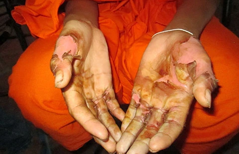 Sau khi điều trị bỏng, bàn tay của tăng sinh Mai hiện đang lên da non, được cho là bỏng độ 2 với diện tích 6% cơ thể. Ảnh: N.NAM