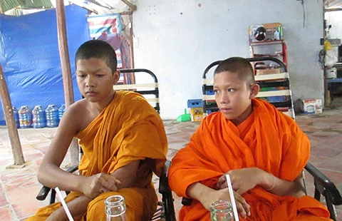 Tăng sinh Lộc (trái) đã xuất viện ngày 23-3 sau một tuần điều trị, tăng sinh Mai hiện còn điều trị tại BV Đa khoa Vĩnh Châu. Ảnh: N.NAM