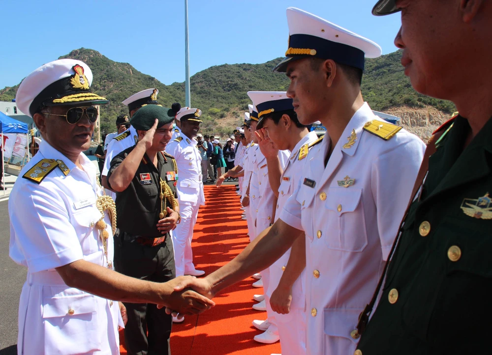 Sĩ quan hai nước chào mừng chuyến thăm của hai tàu chiến Ấn Độ.