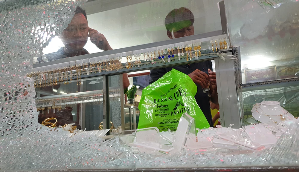 Cả hai vào bên trong tiệm vàng, một người cầm búa đập tủ kính. Người còn lại rút súng từ lưng quần chĩa vào trong thị uy rồi bắn về phía chủ tiệm là anh Nguyễn Văn Thông (43 tuổi). Tủ kính vỡ, thanh niên còn lại lấy nhiều khay vàng đổ vào trong chiếc túi xách.