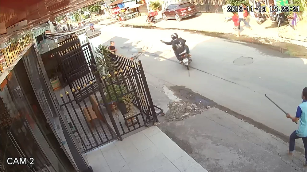 Người dân đuổi theo, ném xe đạp vào hai tên cướp để ngăn cản nhưng không được. Ảnh cắt từ clip.