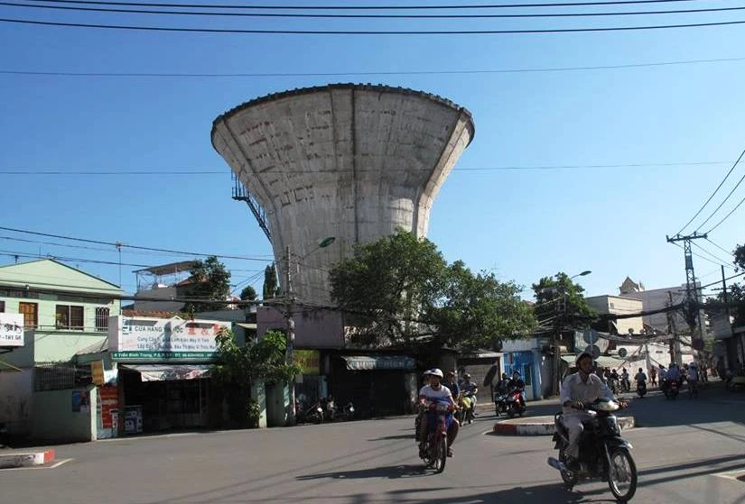 Thủy đài ở đường Nguyễn Văn Đậu trước khi tháo dỡ. Đây là một trong sáu thủy đài nấm khổng lồ được xây trước năm 1975 và chưa từng được đưa vào sử dụng. Ảnh: KB