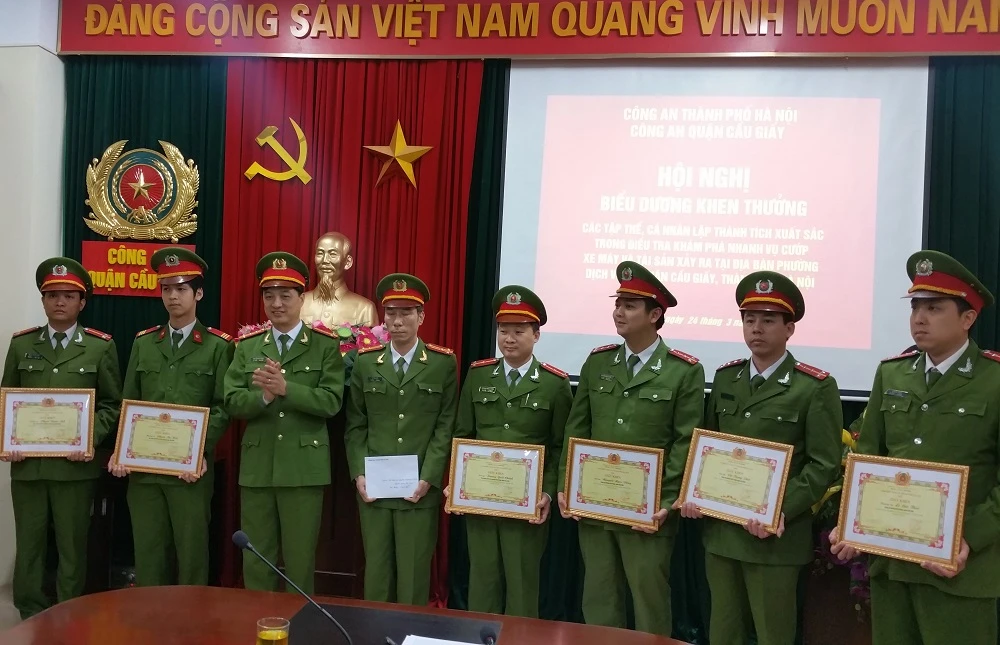 Công an TP Hà Nội cùng Công an quận Cầu Giấy khen thưởng các cá nhân và đơn vị trong việc khám phá vụ án trên.