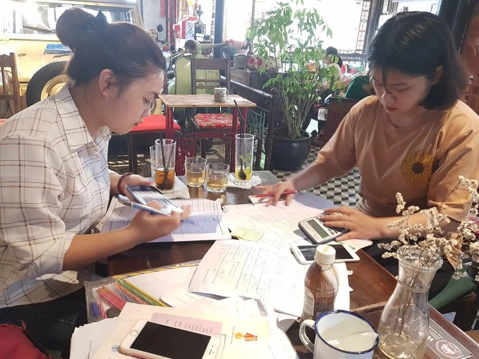 Sau buổi thi môn Văn, Thu Trang và Thùy Trang nghỉ ngơi trong quán cà phê cạnh điểm thi. Không yên tâm về bài thi môn Toán sẽ diễn ra vào chiều nay, Thu Trang và Thùy Trang mang tài liệu ra ôn lại. "Chúng em thấy hơi lo lắng dù đã ôn tập rất kỹ nên cứ mang tài liệu ra làm lại. Cũng vì lo lắng nên trưa nay hai đứa đều không ăn uống được gì", Thu Trang chia sẻ.