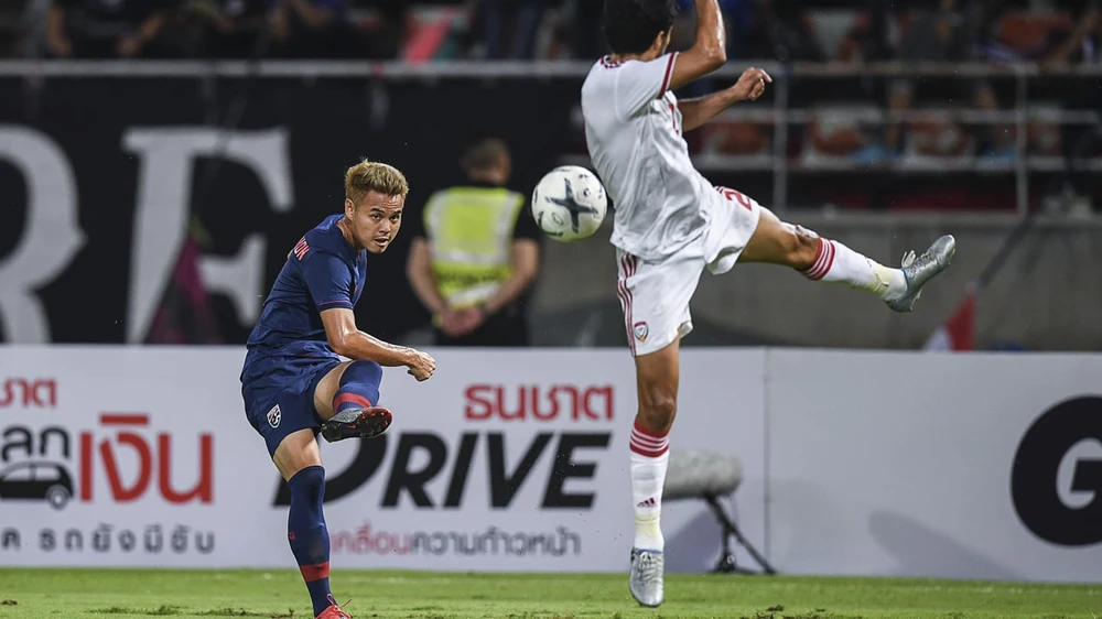 Theerathon (phải) từng là tội đồ của Thái Lan khi sút phạt 11m bị thủ môn Văn Lâm vô hiệu ở lượt về vòng loại World Cup bảng G tại Mỹ Đình. Ảnh: AFC.
