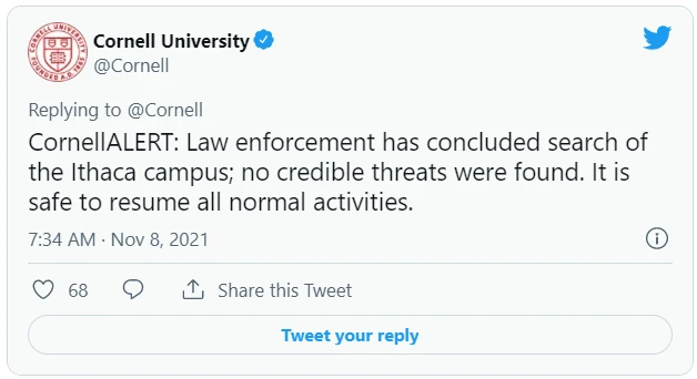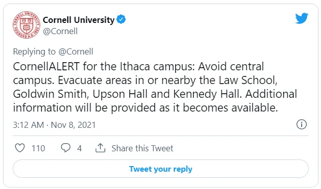 ĐH Cornell sau đó đã đăng tải một loạt dòng tweet yêu cầu sinh viên, nhân viên và khách tham quan ngay lập tức rời khỏi những vị trí này cũng như tránh xa khu vực khuôn viên trung tâm.