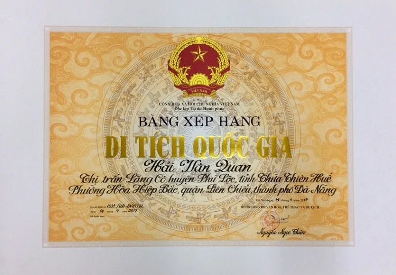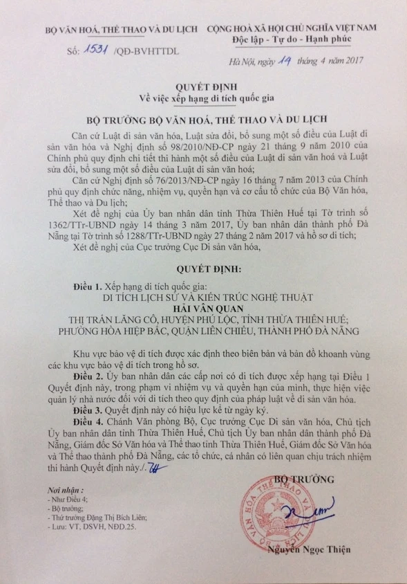 Quyết định công nhận Hải Vân Quan là di tích lịch sử và kiến trúc nghệ thuật cấp quốc gia.