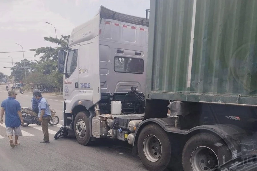 Cú va chạm khiến cả xe máy và vợ chồng ông Thương bị cuốn vào phía trước gầm xe container. Bà Thanh tử vong tại chỗ, người chồng bị thương.