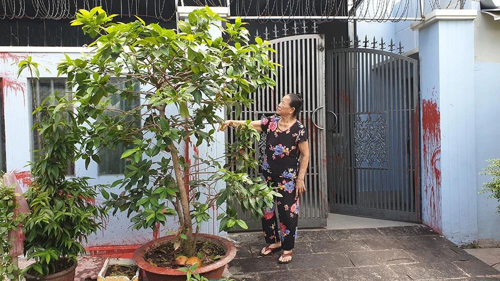 Bà kể: Tháng 7 năm trước, nhà tôi bị sáu lần bị khủng bố tạt sơn trộn với nhiều chất bẩn bỏ vào chai thủy tinh. Họ canh đêm tối ném vào nhà, cửa, camera… Gia đình có báo công an nhưng đến nay cũng chưa thấy giải quyết.