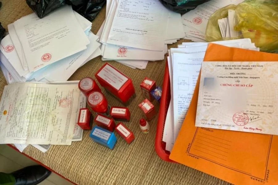 Ngoài ra, cơ quan công an còn phát hiện hơn 1.000 tờ giấy khám sức khỏe, đơn xin việc, sơ yếu lý lịch, sổ hộ khẩu có đóng mộc dấu của các cơ quan, tổ chức và chữ ký cùng các tang vật khác có liên quan.