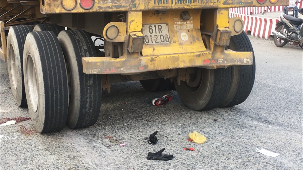 Theo thông tin ban đầu, khoảng 15 giờ 24-11, cặp vợ chồng di chuyển bằng xe máy hướng về Khu công nghiệp Sóng Thần. Khi vừa qua khỏi cầu vượt thì chiếc xe máy ôm cua trong làn đường ô tô. Lúc này, xe máy bất ngờ bị trượt ngã xuống đường, đúng lúc xe container mang BKS 61C-174.60 đang lưu thông cùng chiều đi tới. Cú ngã vào gầm ô tô khiến người vợ không may bị bánh xe cán tử vong tại chỗ, riêng người chồng may mắn bị xây xát nhẹ.