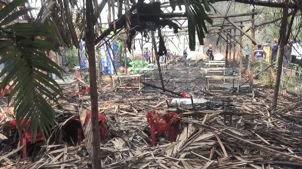Ngọn lửa bùng phát tại kho chứa hóa chất, sau đó lan sang một quán nhậu bên cạnh. Vụ cháy đã khiến kho chứa hóa chất và quán nhậu bị thiêu rụi.