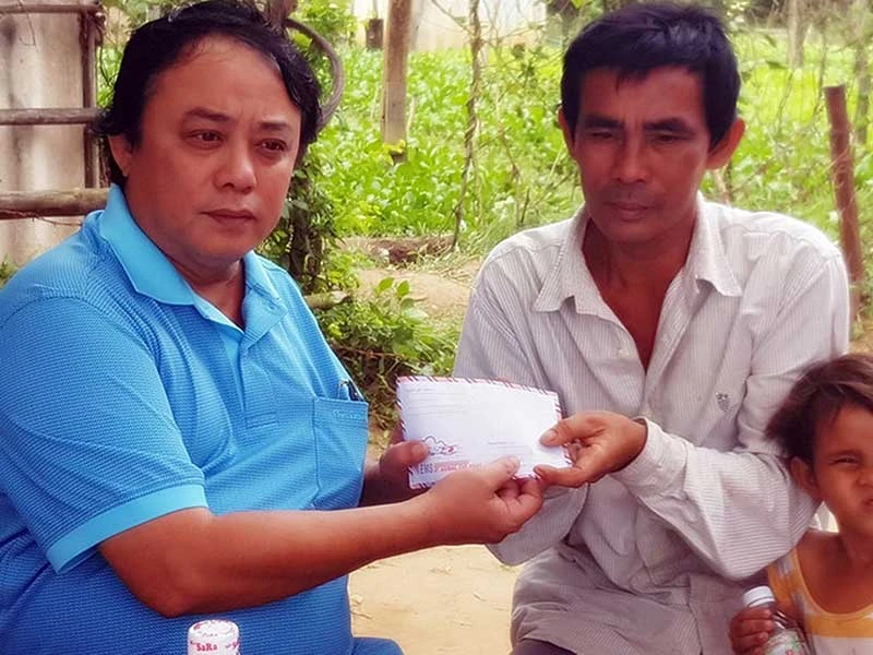 Đại diện Pháp Luật TP.HCMtrao tiền hỗ trợ ban đầu cho hai gia đình có ba con bị chết đuối ở huyện Hàm Thuận Bắc, Bình Thuận. Ảnh: PV