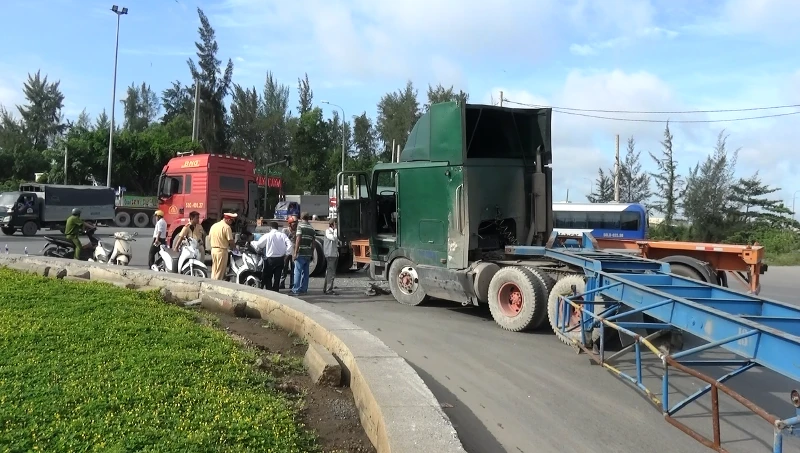 Phần đầu xe container bị móp méo hư hỏng nặng.