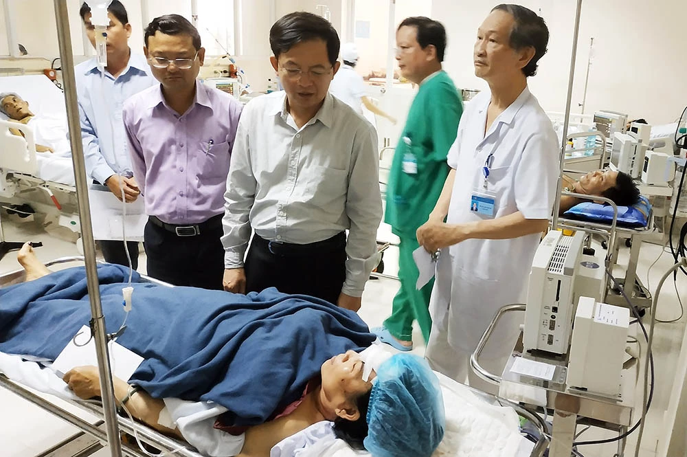 Ông Hồ Quốc Dũng, Chủ tịch UBND tỉnh Bình Định (thứ ba từ trái sang) thăm hỏi, động viên các nạn nhân đang điều trị tại BV Đa khoa tỉnh Bình Định. Ảnh: TĐ
