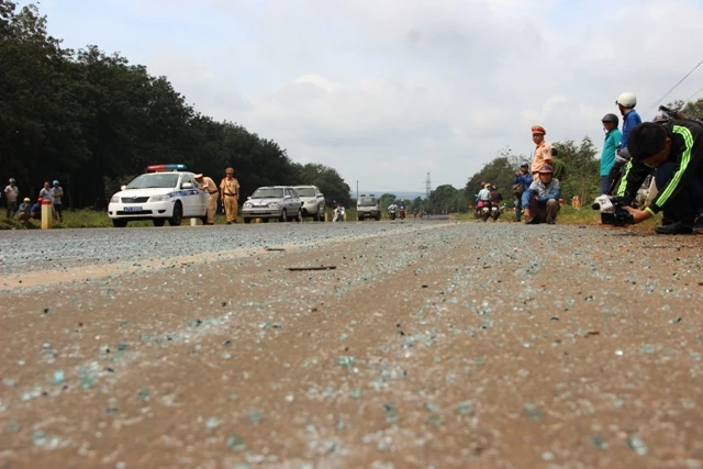 Cả hai xe khách đều bị hư hỏng nặng, kính xe vỡ nát vương vãi trên quốc lộ.