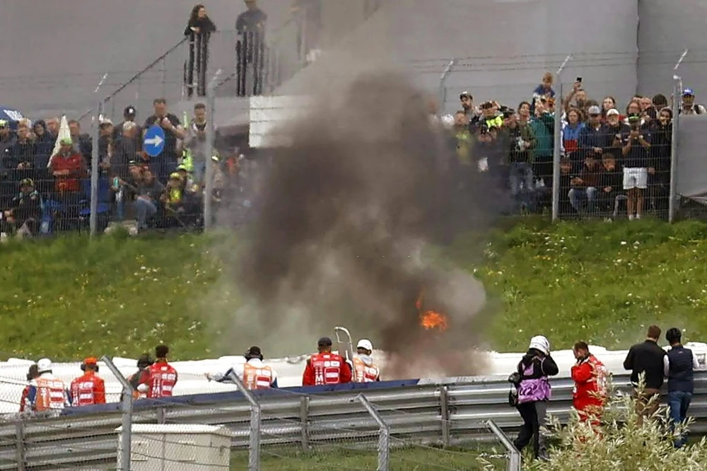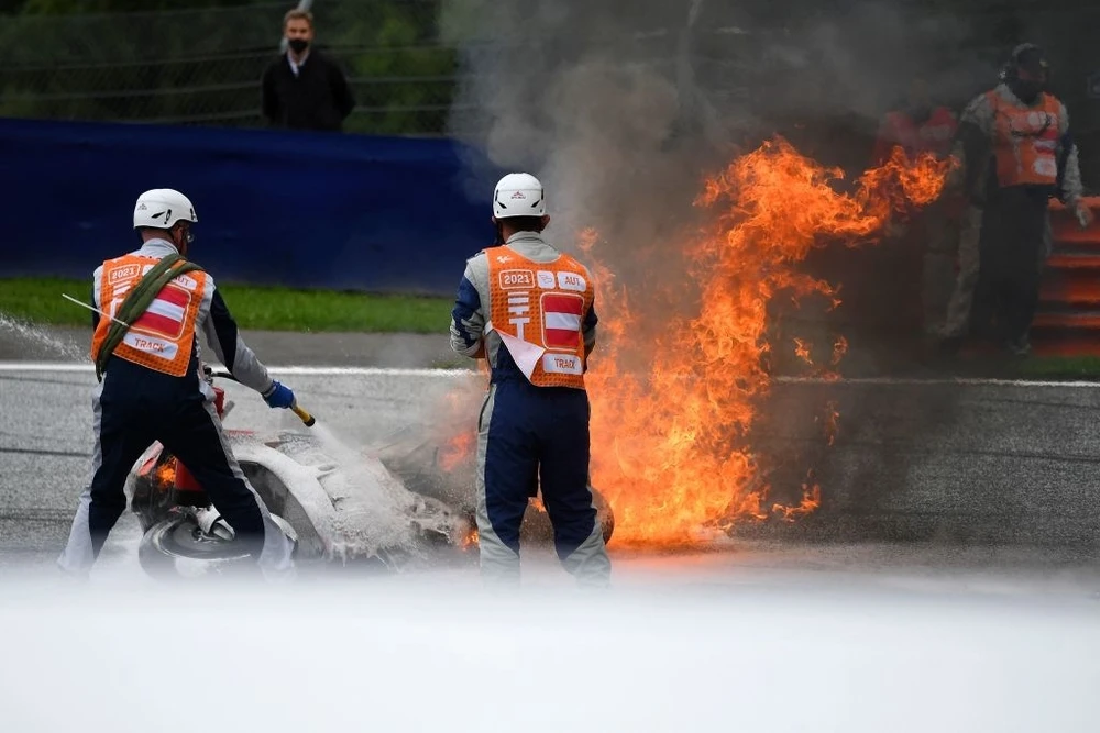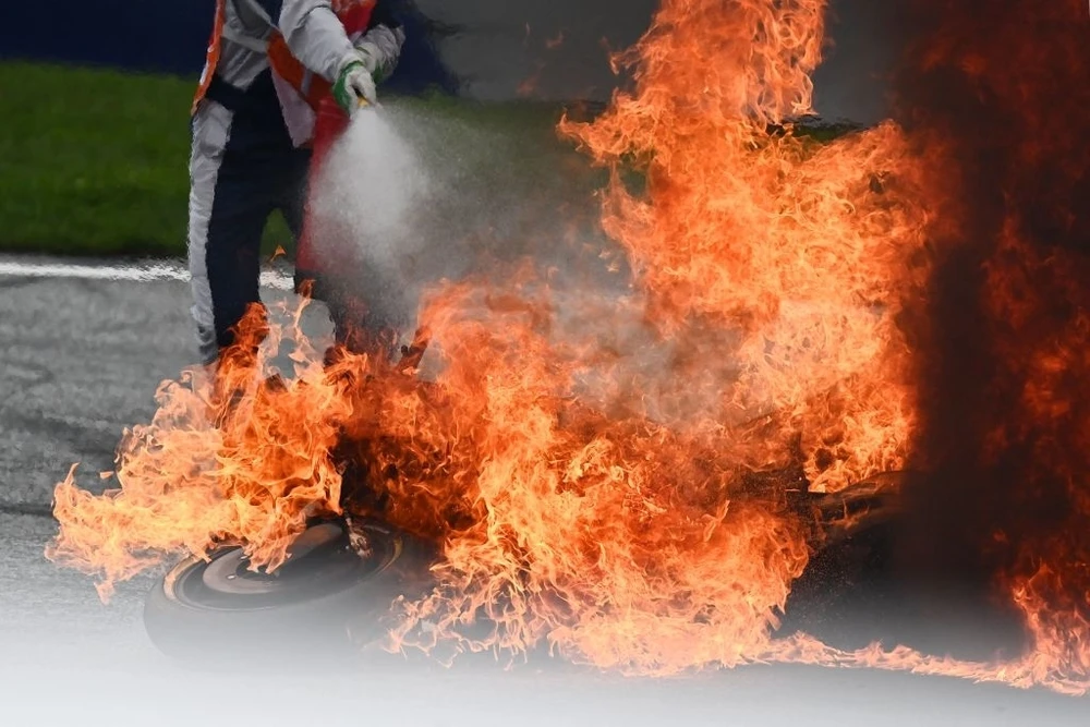 Hai chiếc xe nằm chỏng chơ giữa đường đua. Nhiên liệu từ hai bình xăng chảy chàn, cháy lan bốc khói nghi ngút khắp đường đua trước khi ngọn lửa được khống chế. Sau đó, nhân viên phải dọn sạch các mảnh vỡ, chất lỏng từ bình chữa cháy và làm khô đường đua trước khi cuộc thi đấu trở lại.