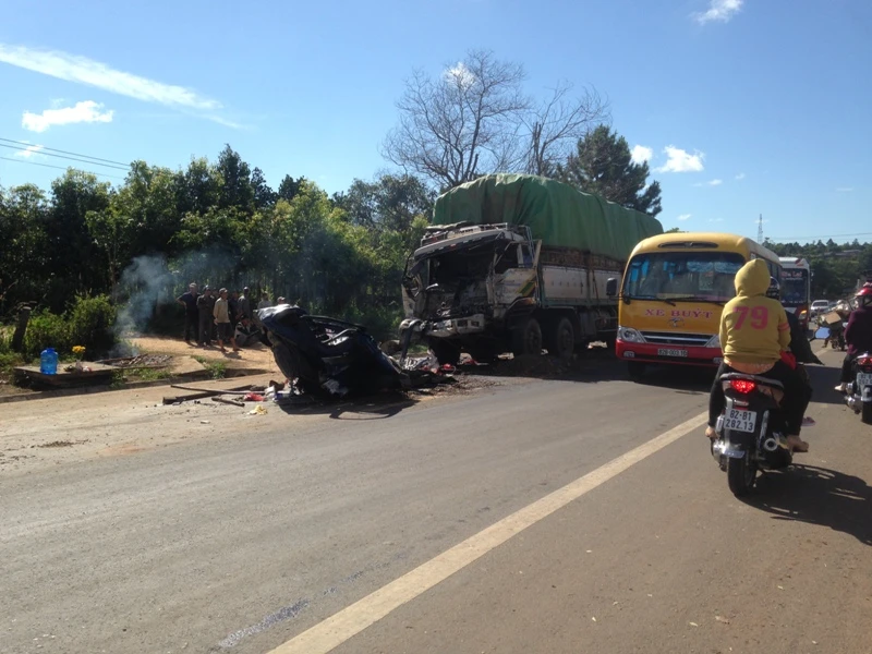 Cú đấu đầu khiến xe tải 81C-089.90 vỡ nát, tài xế và phụ xe bị kẹt cứng trong cabin, tử vong tại chỗ. Tài xế và phụ xe 77H-0072 bị thương rất nặng.