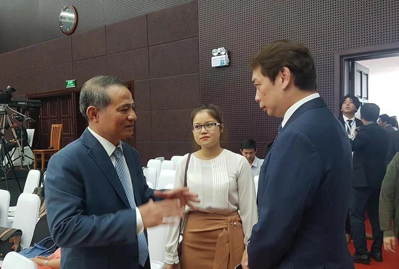 Bí thư Thành ủy Đà Nẵng Trương Quang Nghĩa (trái) trao đổi với các nhà đầu tư bên lề Tọa đàm mùa Xuân 2019. Ảnh: TẤN VIỆT