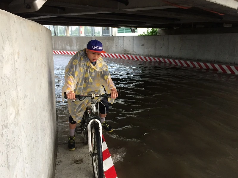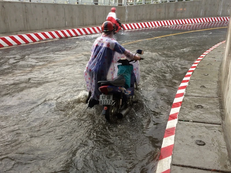 Nơi sâu nhất ngập khoảng 50 cm. Hầm chui biến thành sông sau ít phút. Các xe máy hầu như không thể qua lại.