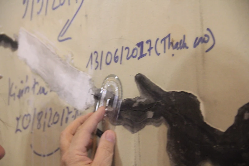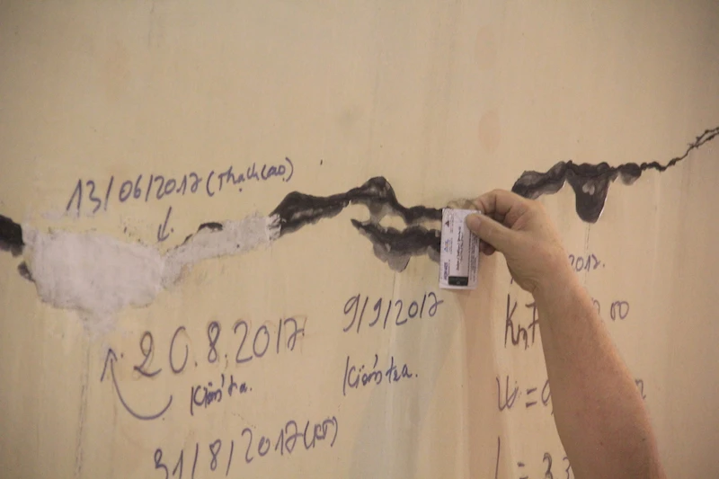 Các vết nứt được đo chi tiết. Ảnh: TẤN VIỆT