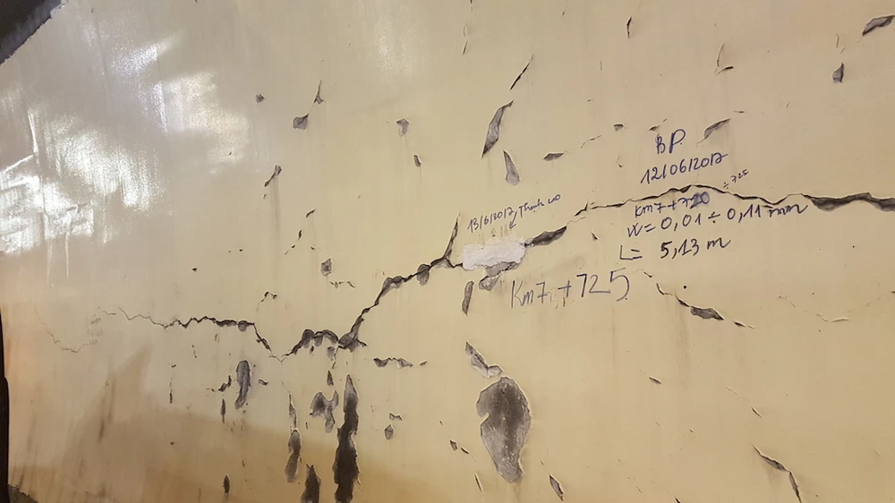 Hàng loạt vết nứt xuất hiện trong hầm Hải Vân từ năm 2014 làm bong tróc lớp sơn epoxy bên ngoài. Tư vấn giám sát dự án liên tục quan trắc, đánh dấu ngay trên vết nứt để theo dõi quá trình biển đối của vết nứt. Ảnh: TẤN VIỆT