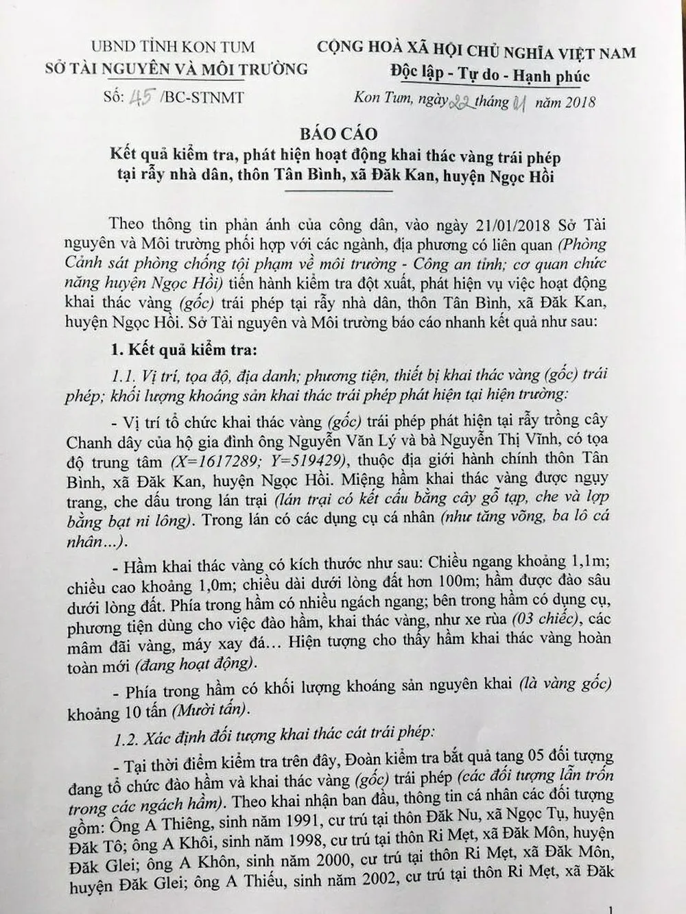 Sở TN&MT tỉnh Kon Tum vừa có văn bản gửi UBND tỉnh này báo cáo về việc kiểm tra, phát hiện vụ khai thác vàng trái phép diễn ra tại thôn Tân Bình, xã Đak Kan, huyện Ngọc Hồi.