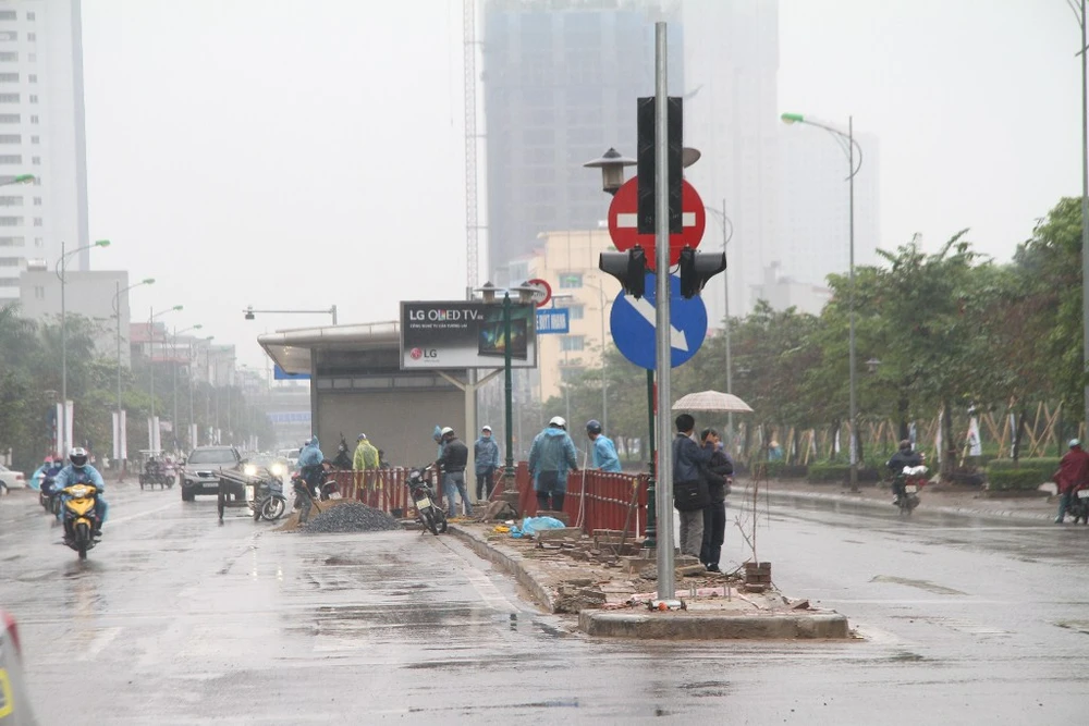 Sáng 15-12, công nhân vẫn đang đội mưa hoàn thành các hạng mục còn lại. Ảnh: PHI HÙNG