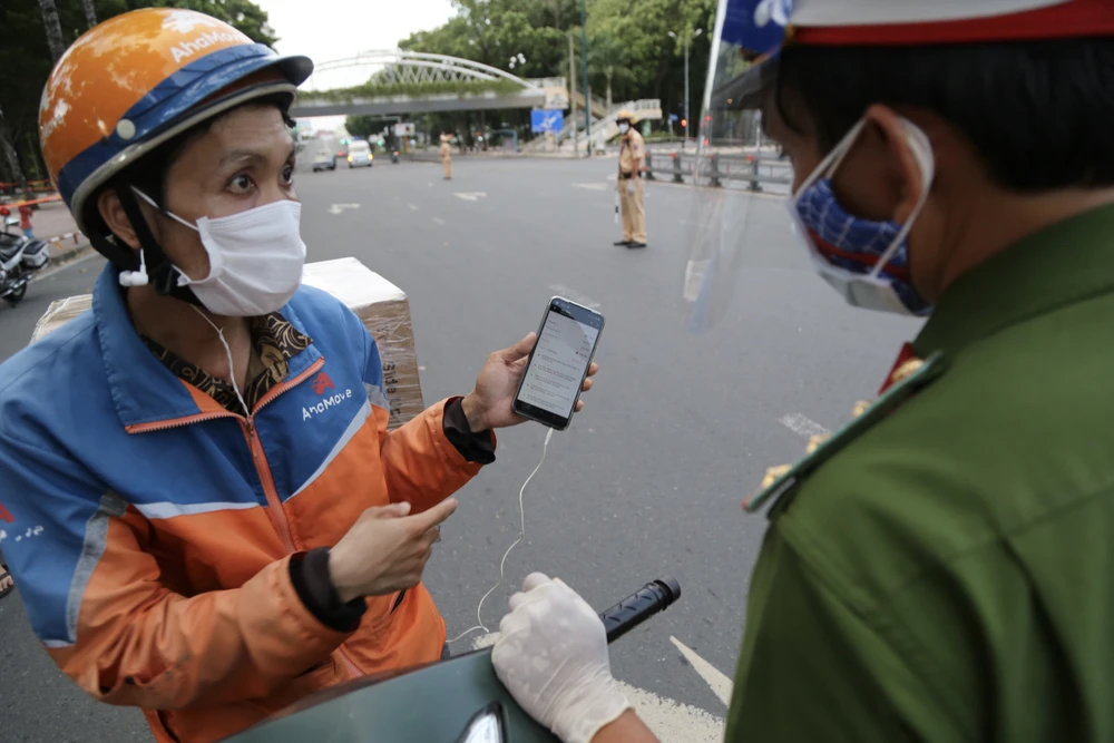 “Chỉ xe có mã luồng xanh thì mới đi qua được, thành phố đang thực hiện hạn chế ra đường sau 18 giờ” - CSGT giải thích thêm.