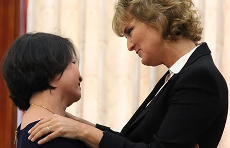 Trong buổi giao lưu sáng 12-8, tác giả Annette Herfkens đã ôm chầm chị Nguyễn Thị Lan (vợ cơ trưởng Nguyễn Quang Vinh - người điều khiển chiếc trực thăng cứu hộ bị tử nạn) như một sự thấu hiểu và chia sẻ nỗi đau mất đi người yêu thương.