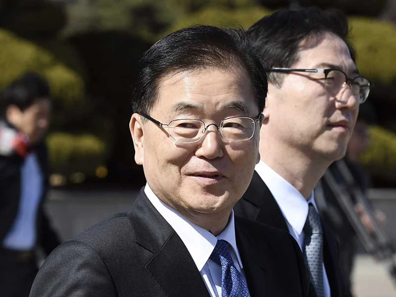 Hai vị quan chức nói trên là ông Chung Eui-yong (ảnh), lãnh đạo Văn phòng an ninh quốc gia Hàn Quốc và ông Suh Hoon, lãnh đạo cơ quan tình báo quốc gia. Ông Chung vào hôm nay 12-3 sẽ gặp Chủ tịch Trung Quốc Tập Cận Bình. Còn ông Suh sẽ đến Nhật Bản trao đổi với Thủ tướng Shinzo Abe vào ngày 13-3, hãng tin Reuters cho biết.