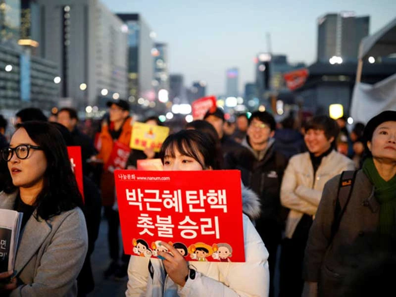 Người biểu tình tại trung tâm thủ đô Seoul, Hàn Quốc với các tấm biển ghi: “Park Geun-hye đã bị phế truất. Chúng ta đã chiến thắng”. Ảnh: REUTERS