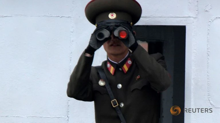 Một binh sĩ Triều Tiên đặt ống nhòm nhìn từ sông Yalu ở Sinuiju, đối diện với TP Đan Đông, Trung Quốc. Ảnh: Reuters
