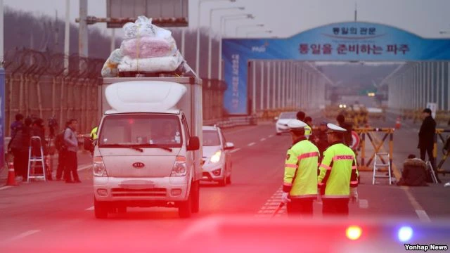 Xe cộ qua lại chiếc cầu nối giữa CHDCND Triều Tiên và Hàn Quốc gần khu công nghiệp chung Kaesong. (Ảnh: YONHAP)