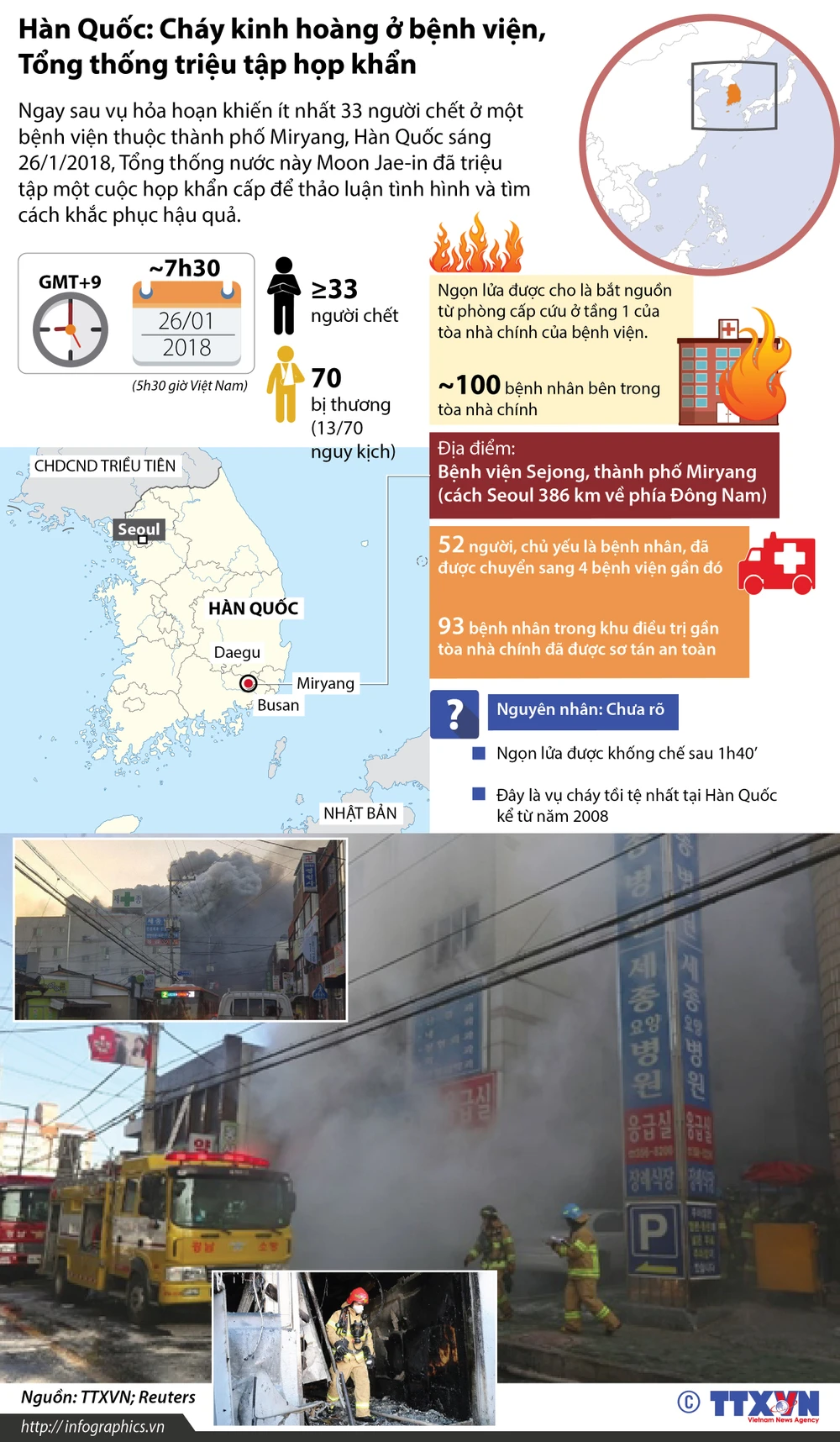 Tổng thống Hàn Quốc triệu tập cuộc họp khẩn cấp về vụ cháy kinh hoàng xảy ra sáng nay 26-1 tại bệnh viện Sejong thuộc thành phố TP Miryang khiến ít nhất 41 người thiệt mạng.