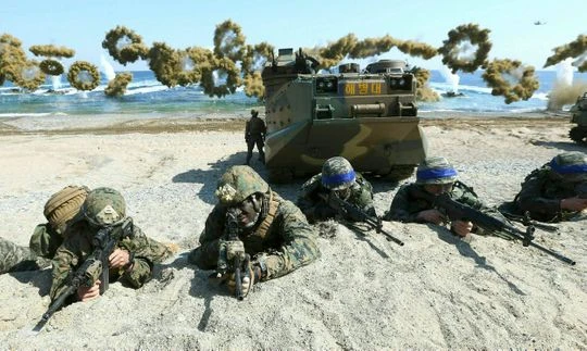 Lính Mỹ và Hàn Quốc trong một cuộc tập trận đổ bộ kết hợp quân sự tại Pohang, Hàn Quốc. Ảnh: AP
