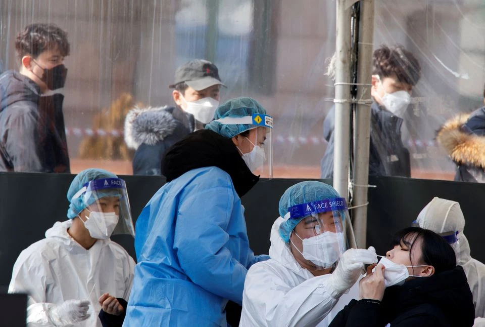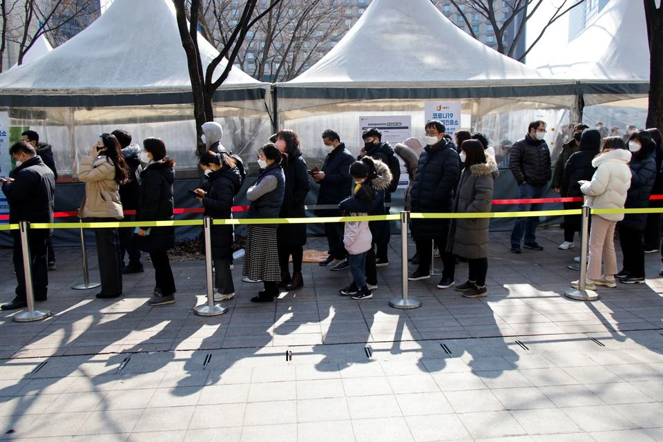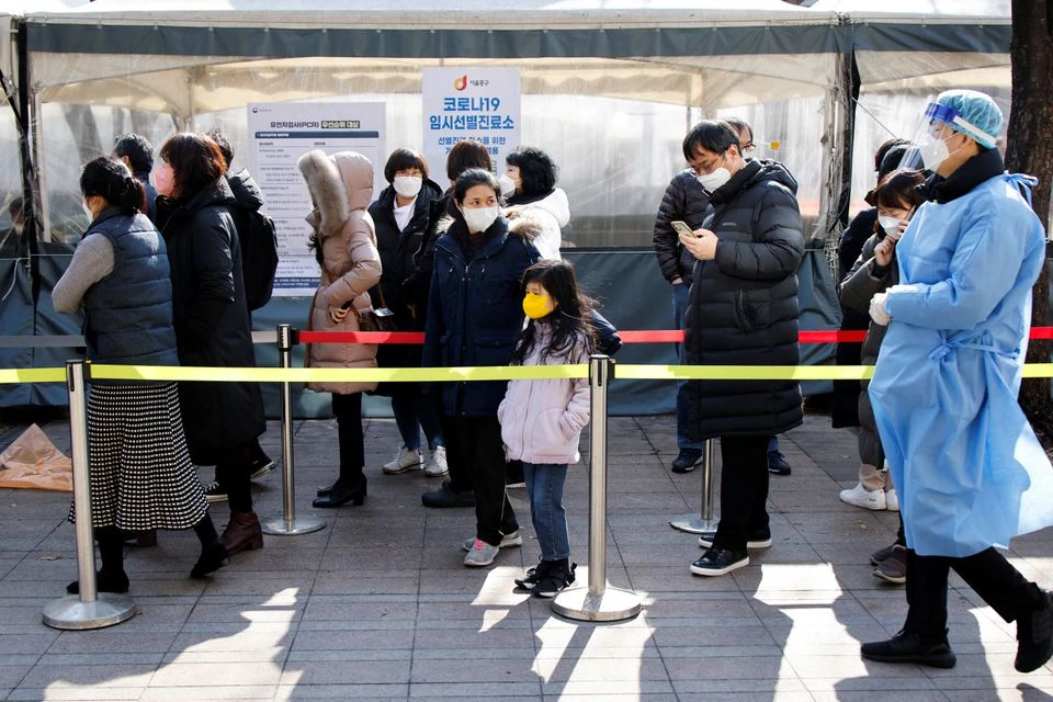 Người dân xếp hàng chờ để được xét nghiệm COVID-19 tại một địa điểm xét nghiệm ở City Hall Plaza, Seoul, Hàn Quốc, ngày 10-2. Ảnh: REUTERS