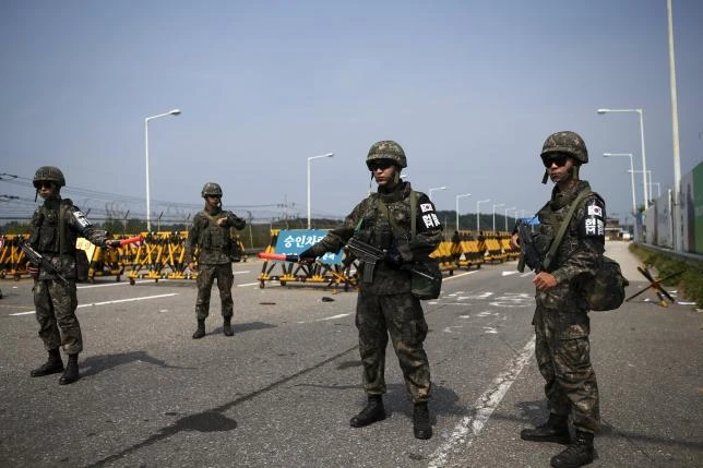 Binh sĩ Hàn Quốc đứng gác ngày 24-8 tại trạm kiểm soát trên Cầu Thống Nhất dẫn đến Bàn Môn Điếm, phía nam khu phi quân sự ngăn cách 2 miền Triều Tiên (Ảnh: REUTERS )