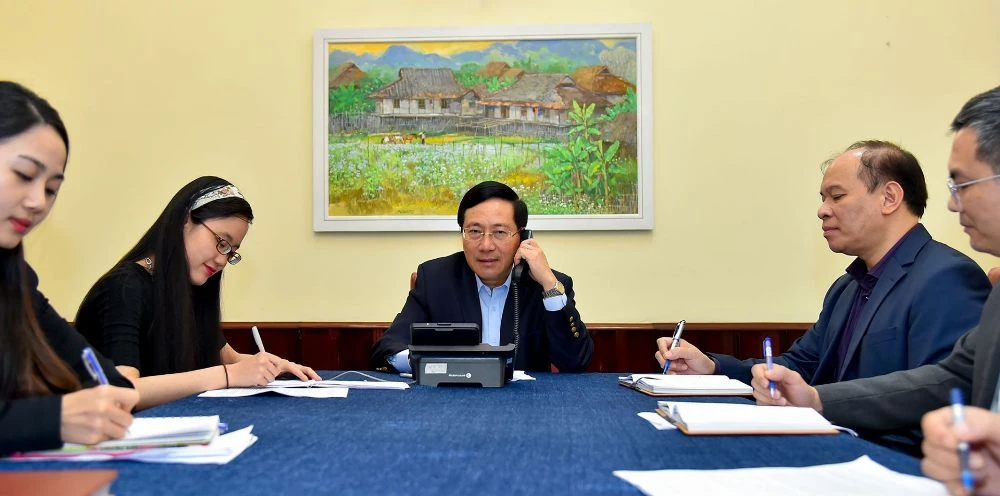 Phó Thủ tướng, Bộ trưởng Ngoại giao Phạm Bình Minh điện đàm với Ngoại trưởng Hàn Quốc Kang Kyung-wha. Ảnh: TG&VN