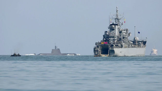 Tàu đổ bộ và tàu ngầm Hàn Quốc tham gia tập trận chung với Mỹ ngày 7-3-2016. Ảnh: AFP