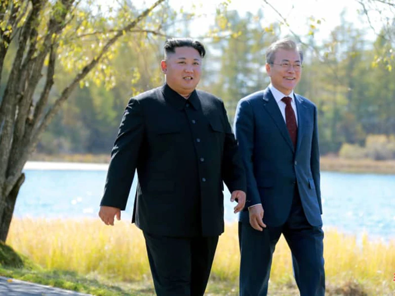 Chủ tịch Kim Jong-un (trái) và Tổng thống Moon Jae-in gặp nhau hồi tháng 9. Ảnh: REUTERS