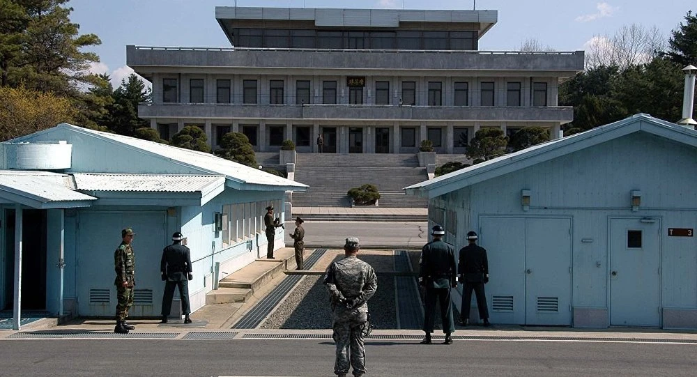 Binh sĩ Triều Tiên và Hàn Quốc cùng một binh sĩ Mỹ tại khu vực an ninh chung ở Bàn Môn Điếm. Ảnh: SPUTNIK