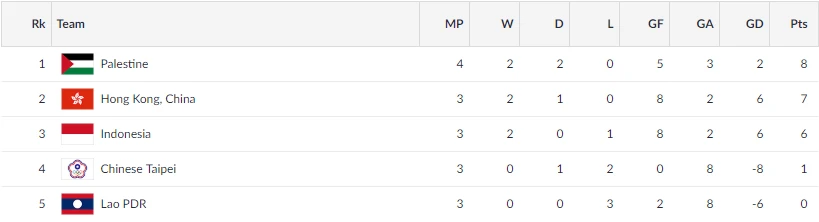 Ở bảng A, chủ nhà Indonesia nhẹ nhàng đánh bại đối thủ cùng khu vực Đông Nam Á Lào 3-0; còn Hong Kong xuất sắc cầm hòa Palestine 1-1. Như vậy ở bảng đấu này, Palestine đã đá đủ bốn trận, có 8 điểm, tạm dẫn đầu và chắc chắn đi tiếp.