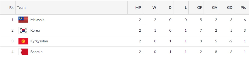 Ở trận đấu còn lại của bảng này, Bahrain hòa Kyrgyzstan 2-2. Điều đáng nói, bàn gỡ hòa của Bahrain đến ở phút 90+4 gián tiếp giúp Malaysia chính thức dẫn đầu bảng sớm một lượt đấu sau hai trận toàn thắng có 6 điểm. Hàn Quốc thứ hai có 3 điểm, còn Bahrain và Kyrgyzstan 1 điểm.