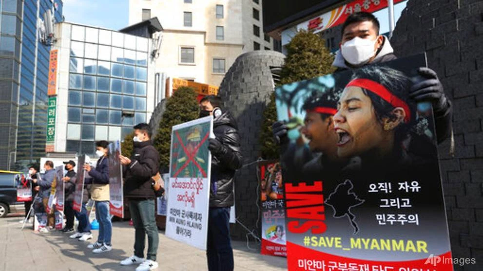 Người dân Myanmar sống tại Hàn Quốc tổ chức biểu tình phản đối chính biến. Ảnh: AP