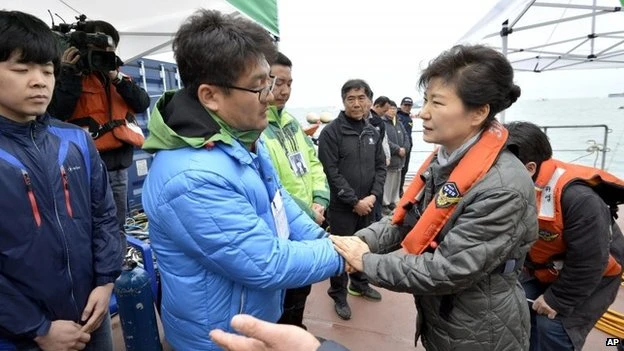 Tổng thống Hàn Quốc Park Geun-hye đã đến đảo Jindo, nơi người nhà nạn nhân phà Sewol đang tập trung để chờ tin tức. Đây là lần thứ hai, tổng thống Park thăm viếng gia đình các nạn nhân. Bà xuất hiện với một phong cách bình dân, gần gũi, ân cần hỏi han và động viên từng người.