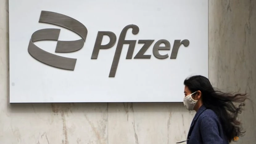 Một cô gái đi ngang qua logo tập đoàn dược phẩm Mỹ Pfizer ở thành phố New York, Mỹ, ngày 1-4. Ảnh: REUTERS