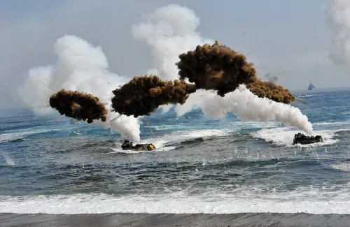Quân đội Hàn Quốc và Mỹ tập trận chung ngoài khơi thành phố Pohang, cách thủ đô Seoul 374 km về phía đông nam. Triều Tiên cho rằng cuộc tập trận thường niên này là hành động chuẩn bị cho một cuộc xâm lấn của Hàn Quốc - Ảnh: AFP