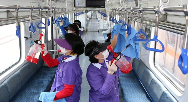 Các nhân viên y tế cộng đồng phun thuốc khử trùng trên tàu điện